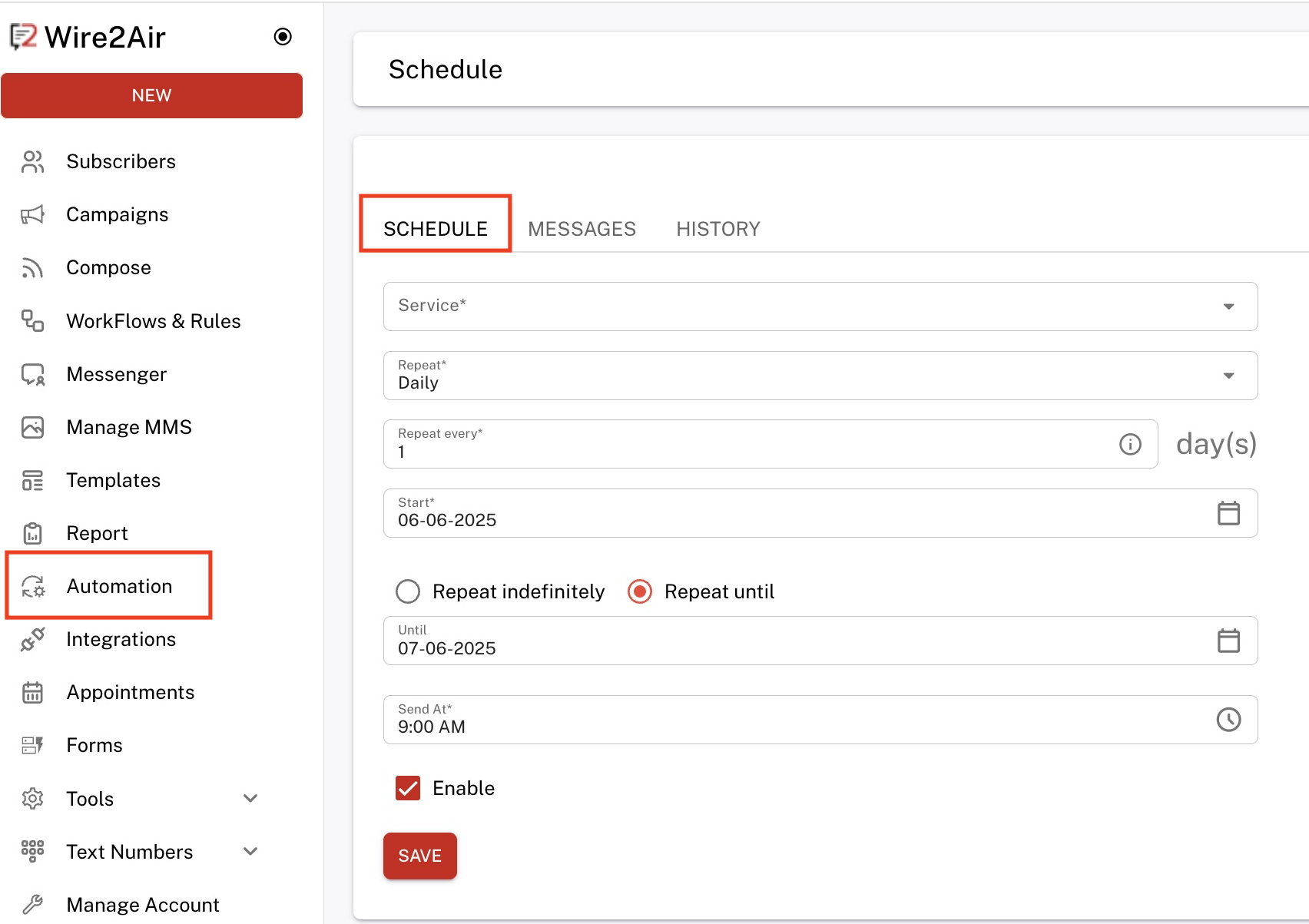 - Click the SAVE button to apply and activate the recurring schedule.