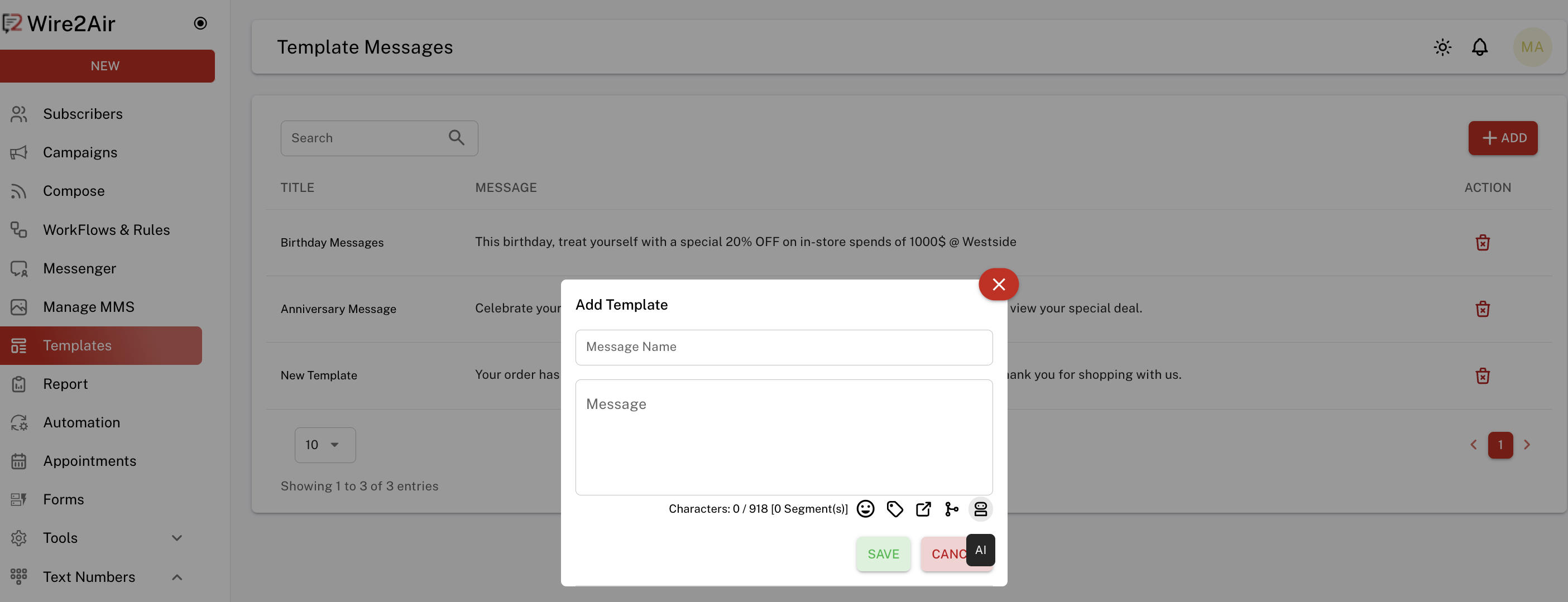 The AI button (bottom-right of the template pop-up) helps auto-generate smart, context-aware messages.
