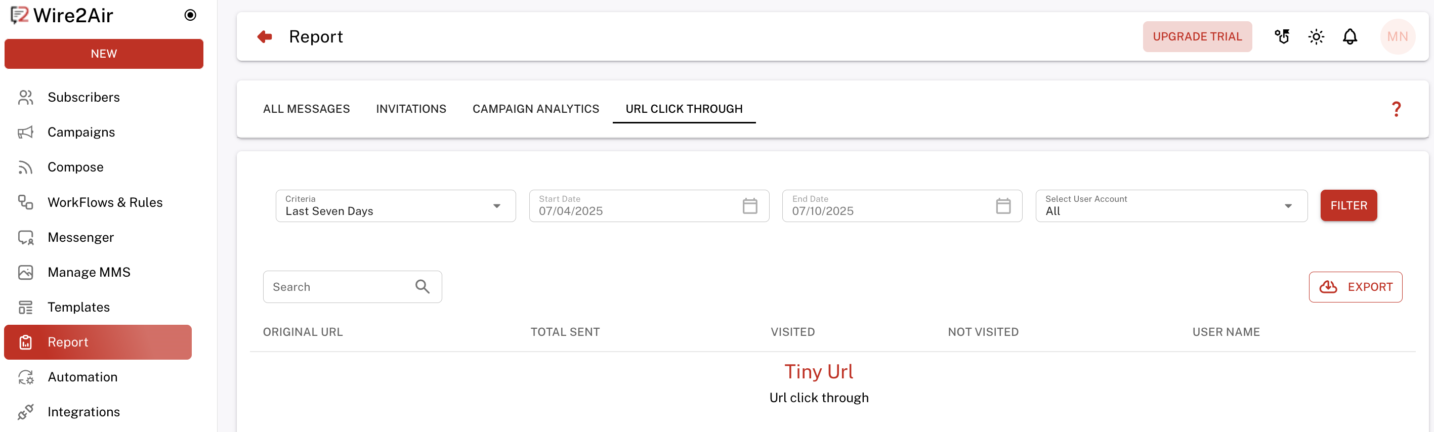 The URL Click Through reporting tab allows you to track how your recipients interact with the shortened links (Tiny URLs) included in your SMS/MMS campaigns. This is crucial for measuring engagement, conversion, and ROI on your text messaging efforts.